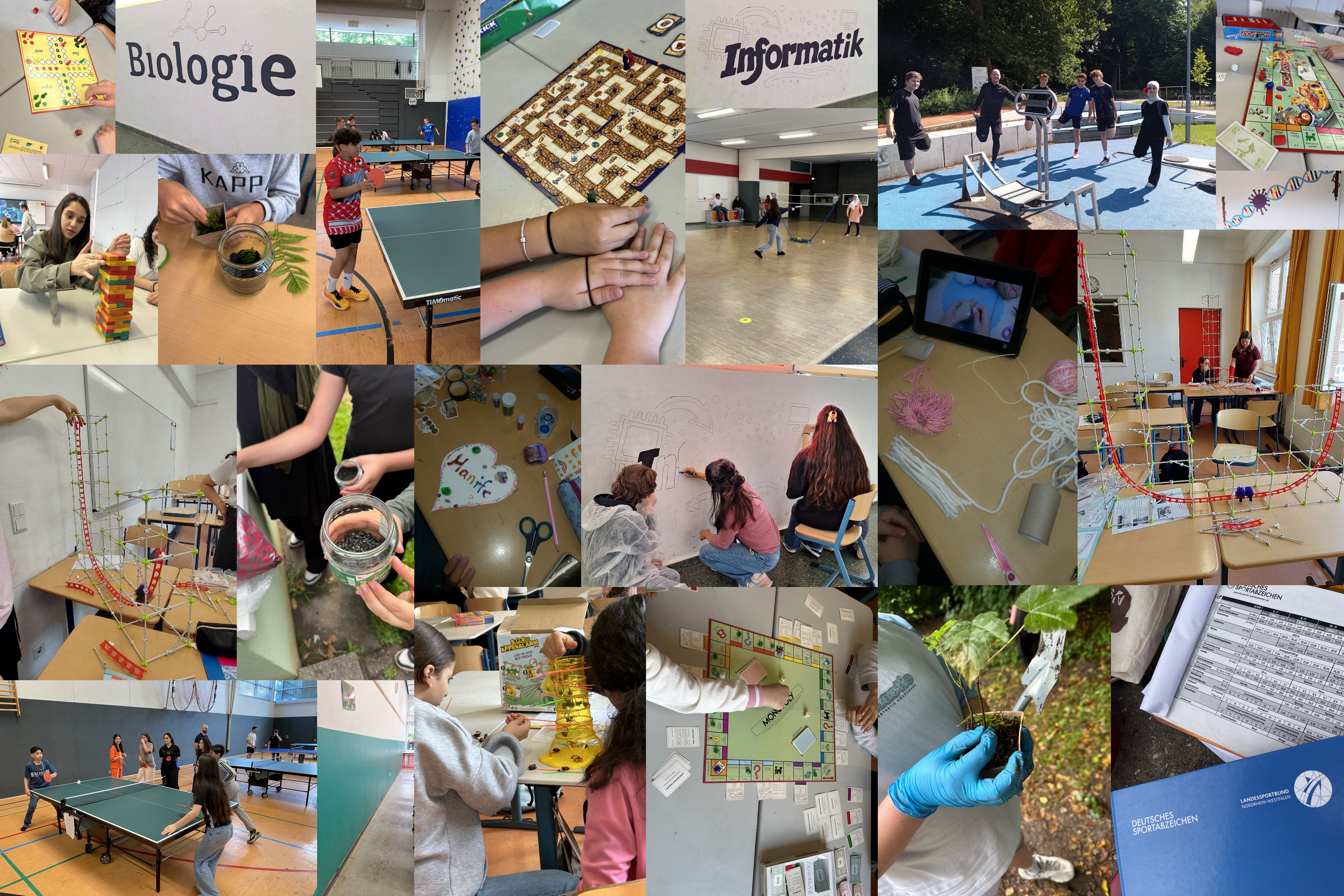 Das Angebot war dabei so vielfältig wie die Interessen der Schulgemeinschaft: Es gab Projekte zur Landeskunde und Sprache (z. B. Japan, Türkei, Italien), zahlreiche Sportaktivitäten wie das Deutsche Sportabzeichen, Tischtennis, Flag-Football oder Jogging, aber auch kreative und praktische Angebote wie Basteln, Spielen, Gärtnern, Schulverschönerung, das Anlegen von Flaschengärten oder das Bestimmen von Pflanzen im Wald.