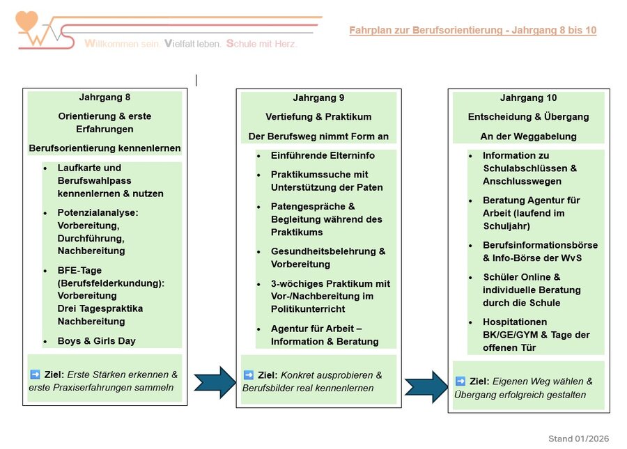Zu Beginn des achten Schuljahres wird an der WvS die Berufsorientierung als fester Bestandteil bis zum Schulabschluss integriert. Während dieser Phase werden die Standardelemente des Landesprogramms KAoA (Kein Anschluss ohne Abschluss) sowie andere schulische Veranstaltungen zur Studien- und Berufsorientierung durchgeführt.