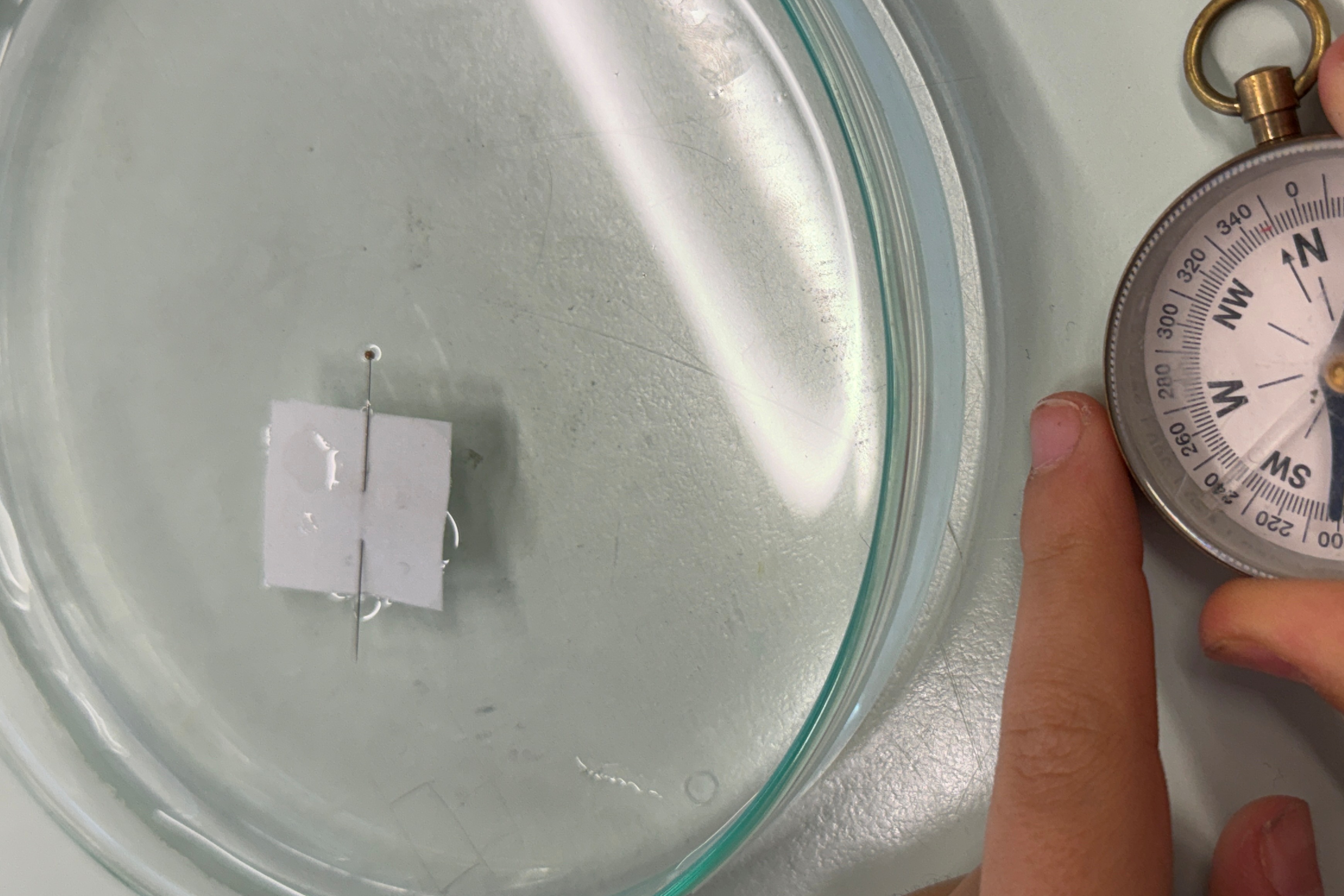 Im Physikunterricht baute die Klasse 5a mit einfachen Materialien einen Kompass. Zunächst wurde eine Petrischale mit Wasser gefüllt. Anschließend magnetisierten die Schülerinnen und Schüler eine Stecknadel, indem sie diese mehrmals in derselben Richtung mit einem Magneten strichen. Danach wurde ein kleines Stück Papier auf die Wasseroberfläche gelegt und die magnetisierte Stecknadel vorsichtig darauf platziert. Nach kurzer Zeit richtete sich die Nadel selbstständig aus und zeigte die Nord-Süd-Richtung an.